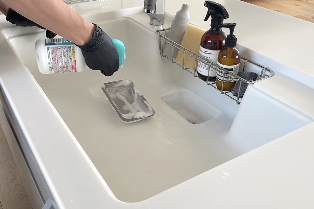 キッチンの排水溝は漂白剤で除菌。ゴミ受けにもスプレーしてぬめりや匂いを予防。仕上げに撥水コーテングをして日々の着色汚れや水垢が付きにくくする。