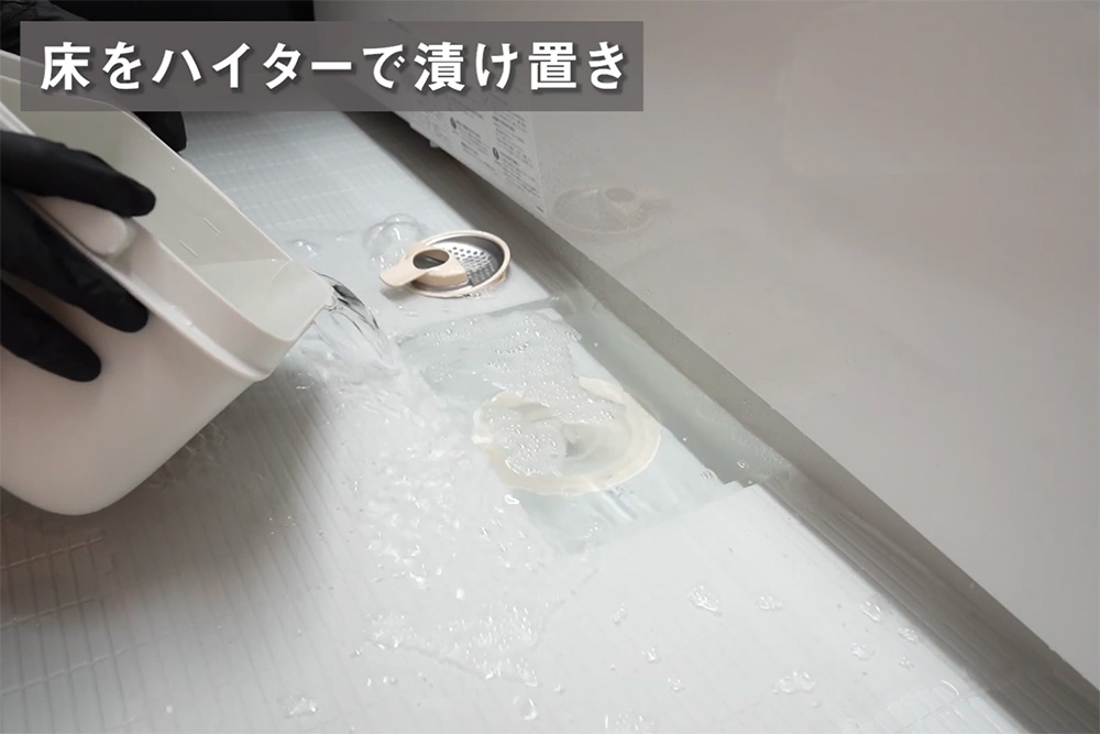 水で薄めたハイターをお風呂の床に流していきます。結果はいかに⁈