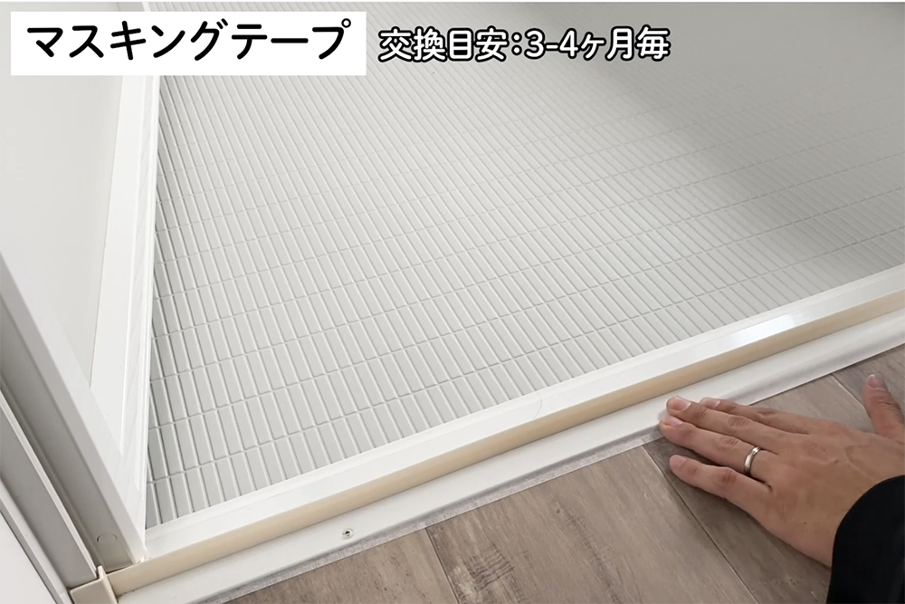 湿気が溜まりやすくホコリやカビが多いお風呂のドアや部屋の巾木には、マスキングテープで事前に汚れを防止。