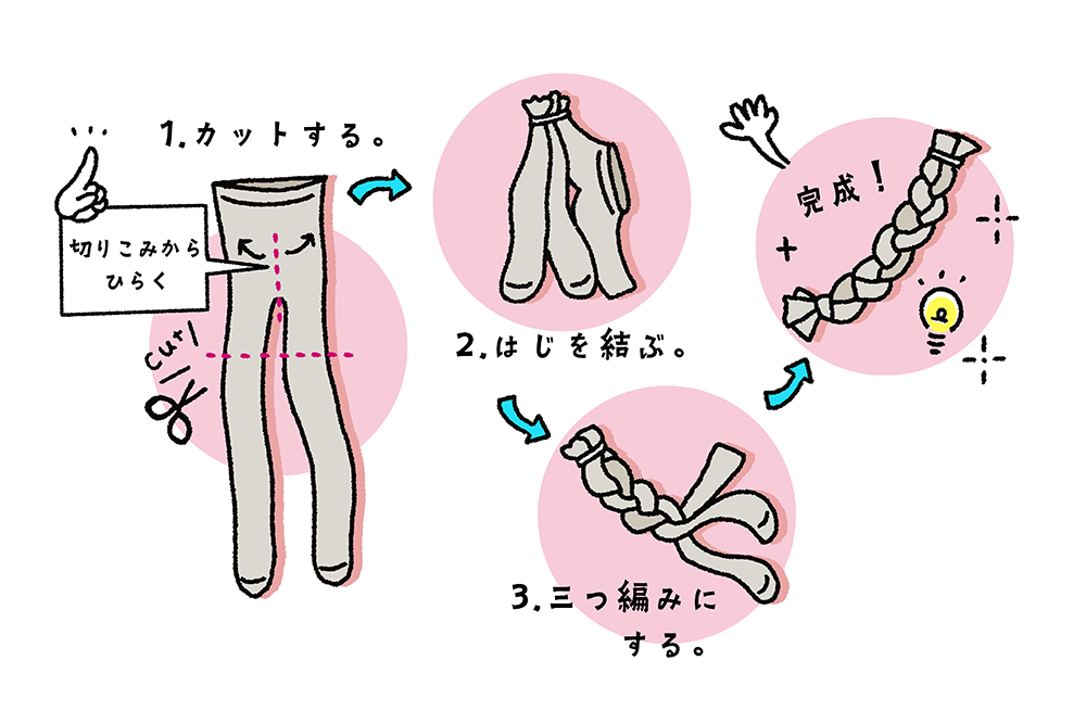 時間を有効活用するには、使い捨てグッズが最適。不要品で手作りすれば、コストもかからずエコですよね。例えば、木下さんおすすめの水垢対策グッズ「古ストッキングを切って三つ編みにしたもの」(下図参照)は、少し水を付けてこすれば、ステンレスの蛇口やシンクがピッカピカになります。洗剤いらずのうえ、子どもの手にも優しい柔らかさなので、お風呂に入ったときに遊びながら掃除ができちゃいます。