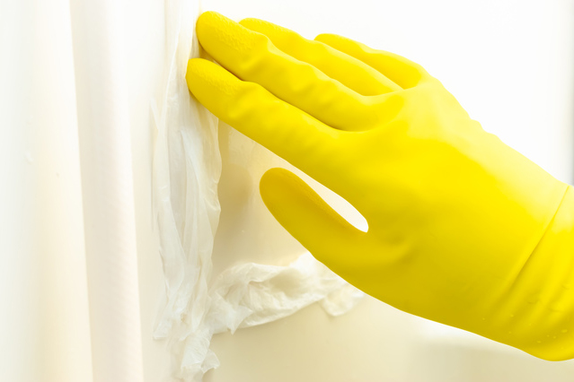 ① パッキンのカビを見つけたら、その場所にキッチンペーパーを置いて洗剤を染み込ませ、ラップで湿布して20~30分置く