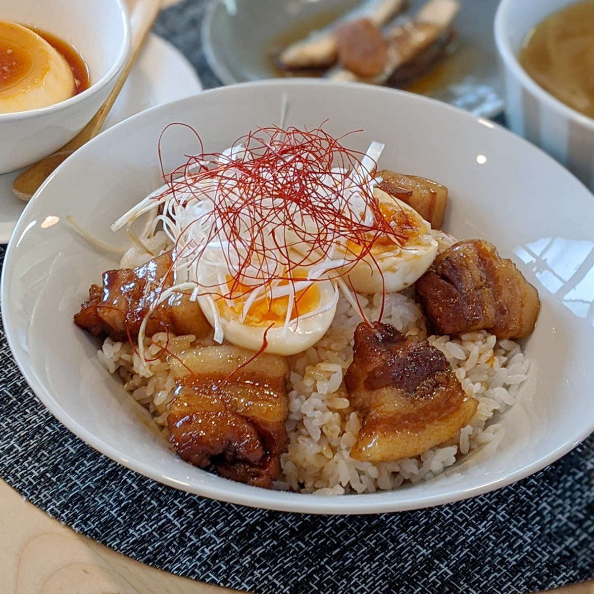 下茹でも煮込みも、圧力鍋だけを使うトロトロの角煮。写真の角煮丼アレンジのほか、おつまみやラーメンの具などにも使えます。