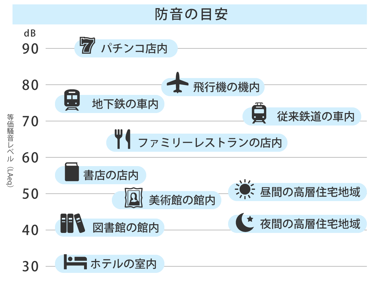 ここでポイントになってくるのが、マンションの遮音性。これは、室外から室内に侵入する音、室内から室外へ漏れる音をどれくらい遮ることができるかを表す性能です。遮音性は周波数ごとにどれくらい音を遮ることができるかを等級で表したもので、周波数ごとの測定値はdB(デシベル)で表されます。