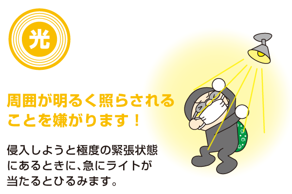 「三つ目は、『光』による侵入防止です。侵入者は、住宅侵入を試みる際はかなりの緊張状態にあるため、急に光を当てられるとひるみます。とくに日没後に明るく照らされれば、暗がりの中で自分の姿が明るく浮き上がってしまうため、正体がばれたくないという気持ちになるようです」