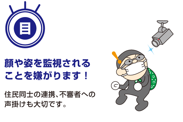 とくに「ご近所による見守り」は、侵入を試みようとする者に「直接見られてしまった」と思わせる効果があります。日頃からの近隣住民間の連携、不審者への声掛けは大切です。