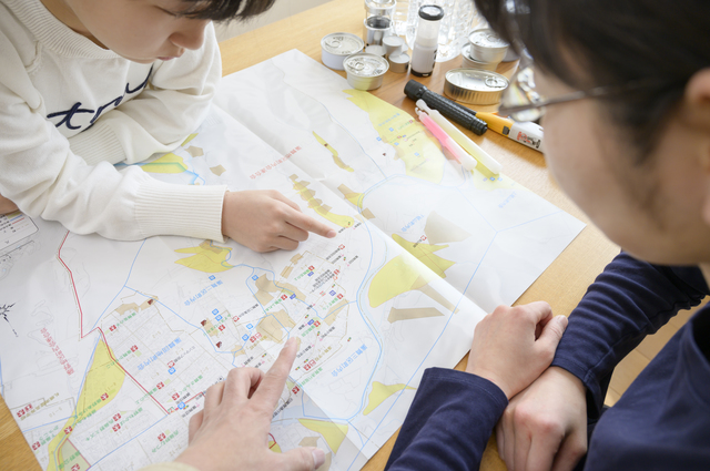 お子さんが児童の場合は、ハザードマップを囲んで、災害時の避難経路を一緒に確認しておくのも、いざという時のためにやっておいたほうがよいかもしれません。
