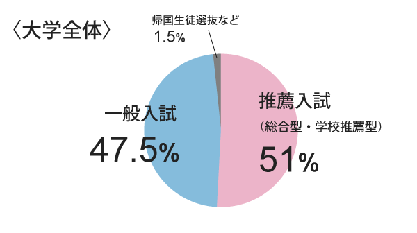 親世代では、ほとんどの方が一般入試を受けてきたと思いますが、2024年では推薦入試の比率が全体の半数にのぼり、私立大では、2人に1人以上となっています。