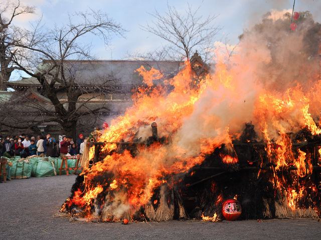 ▲神社の敷地内で行われる「どんど焼き」。門松やしめかざりなどの正月飾りを燃やし、その火や煙に当たることで無病息災や家内安全を願う行事です。