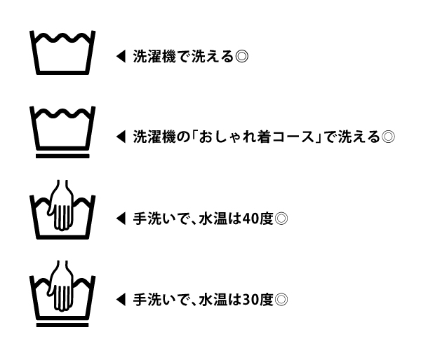 「桶」のマークなら、洗濯機で洗えます。マークの下にラインがあれば、「おしゃれ着コース」で。「桶に手」があるマークの場合は手洗いで、水温は40度が上限。マークの下にラインがあれば、水温の上限は30度です。洗剤は、液体の中性洗剤(おしゃれ着用)を使います。