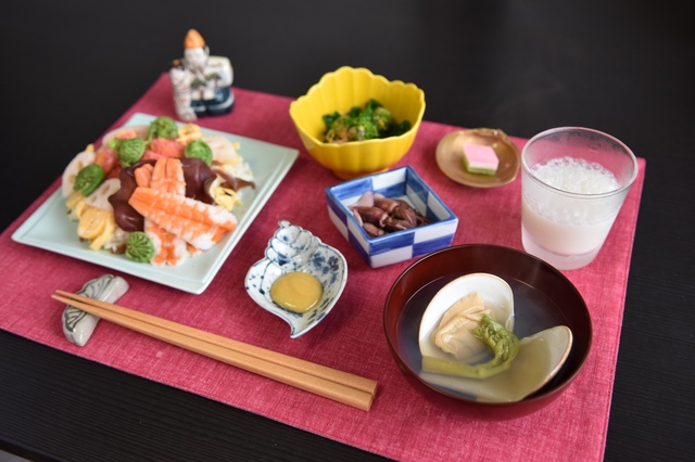 「菱餅」「ひなあられ」には桃色、白、緑の3色が定番として使われますが、これには理由があります。桃色は魔除け、白は子孫繁栄、長寿、純潔、緑は健やかな成長、という願いが込められています。はまぐりを使うのは、対の貝殻しか絶対に合わないことから。ぴったり相性の合う相手と結ばれるようにとの願いが込められています。「ちらし寿司」は縁起のいい具材が多く、華やかな彩りが春らしくお祝いにふさわしいので、ひな祭りの定番メニューとなりました。