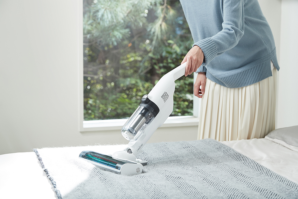 田中さん「本体重量は約1.4kgとレイコップ史上最軽量モデル。従来モデルと比べて大きく軽量化しました。コードレスになったことで、これまでのようにコードを気にしたりせず、また体勢を変えたりもせずに、かけたいところを自由自在に移動させることができます。何より、掃除機で吸い取るだけでなく、UVすることで除菌ができるのが便利。UV照射だけも使えるので、除菌目的で布団以外にも使えます」