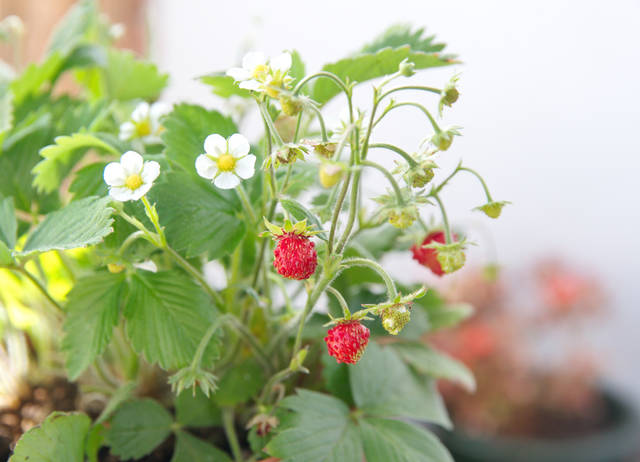 一般的に食用とされるオランダイチゴを小さくしたような姿のワイルドストロベリー。 小粒でもイチゴの甘い香りが漂い、葉の部分はハーブティーにもなります。