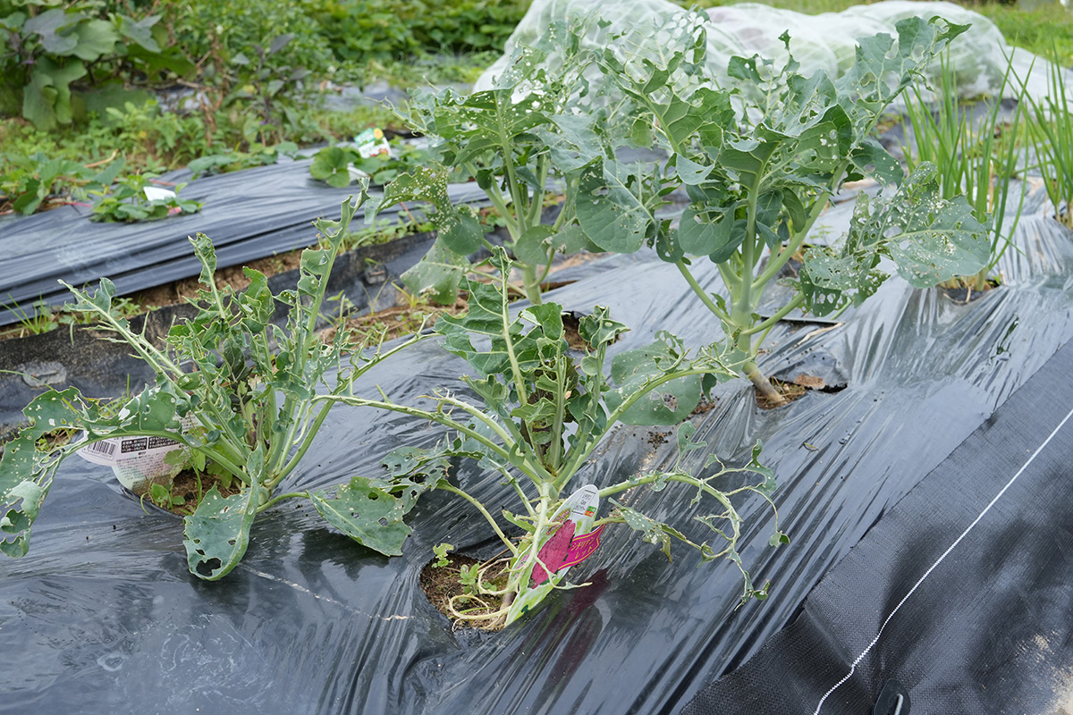 葉っぱを見ると、防虫ネットを被せていない作物はところどころ虫食いが見られます。また、防虫ネットの中にも蝶が成長してネットの中で成長している状態に。