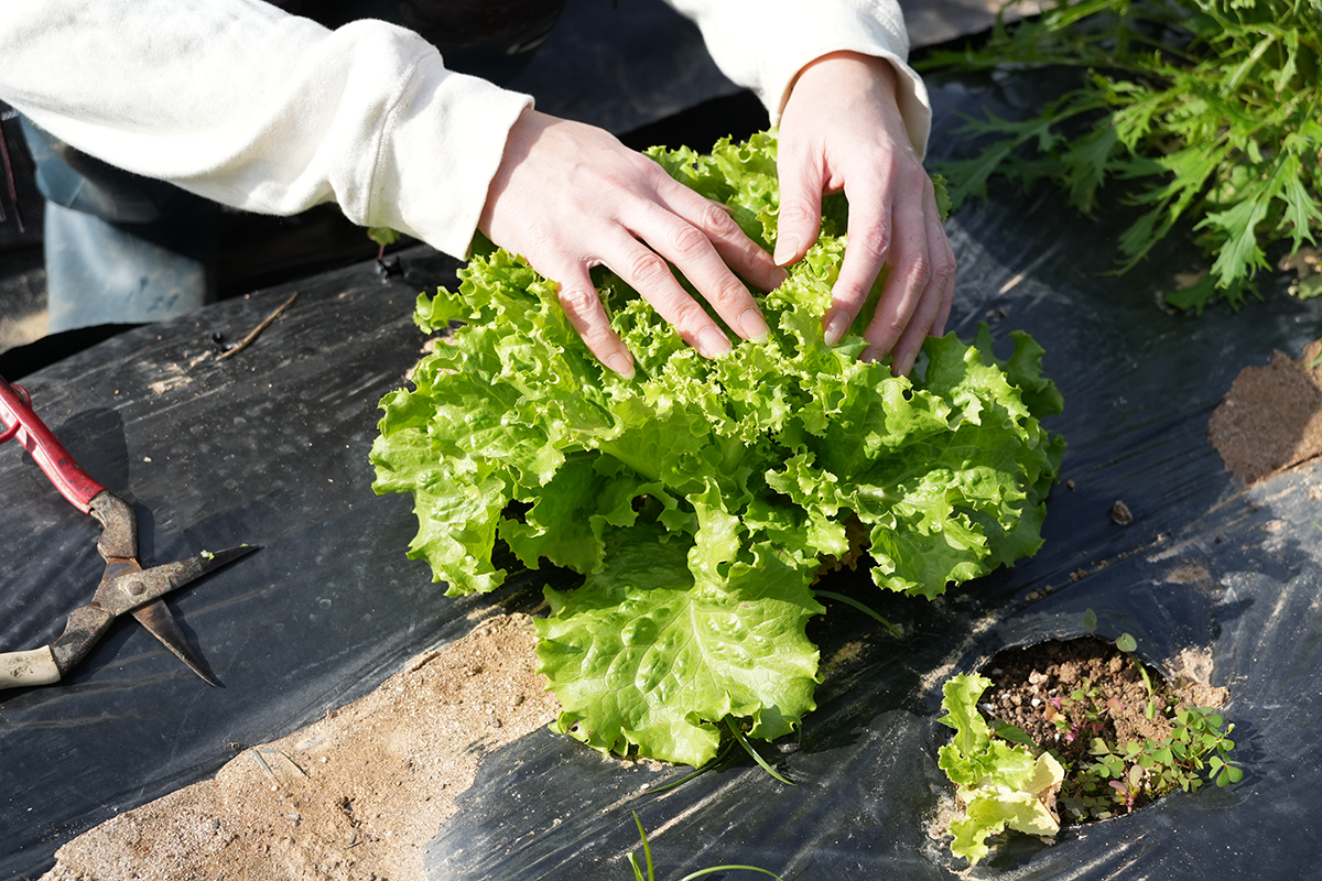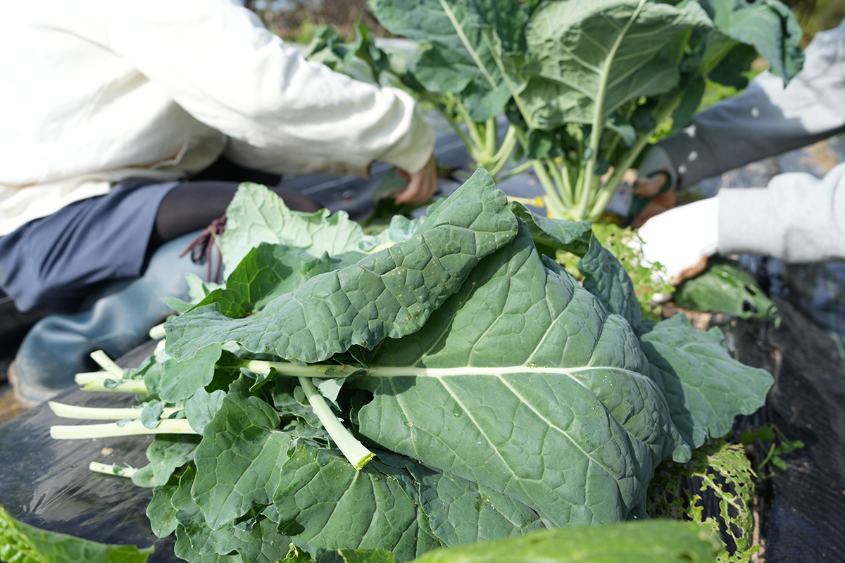 次は、約2ヶ月前に植え付けた作物の収穫に取り掛かります。一目でわかりやすく成長が見られたのは、ケールでした。