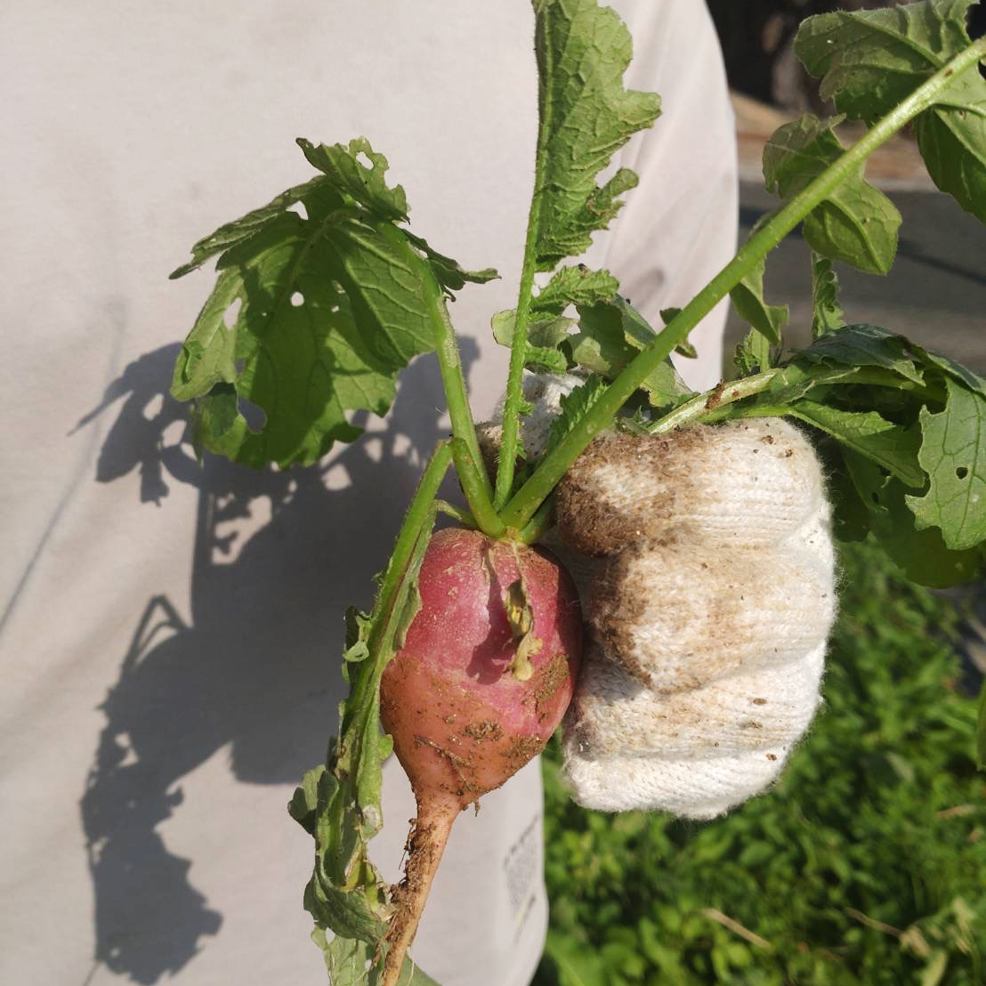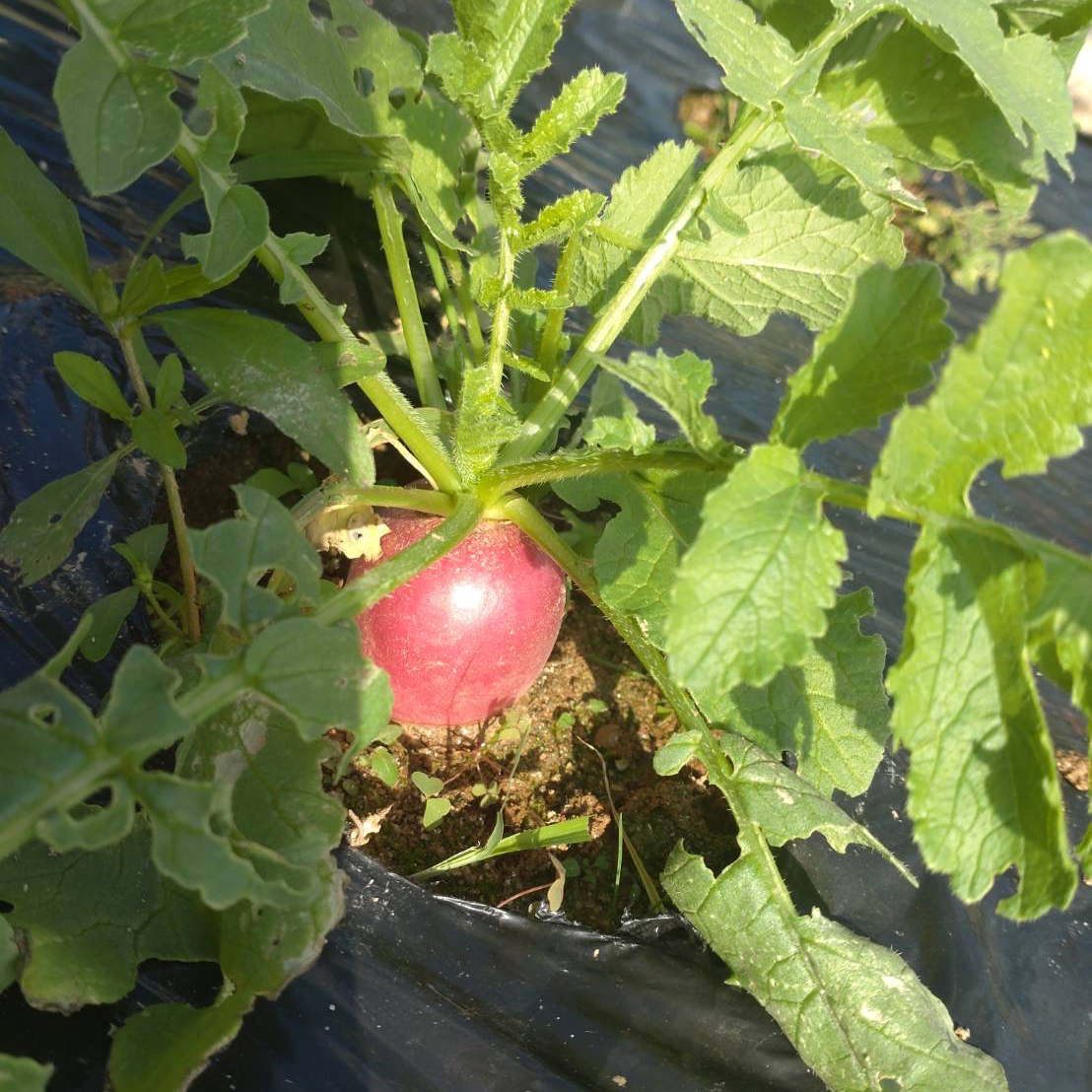 「二十日大根」といわれるラディッシュを、暖かい土の中で30日以上収穫しなかった結果、大きく育ち過ぎてしまいました。