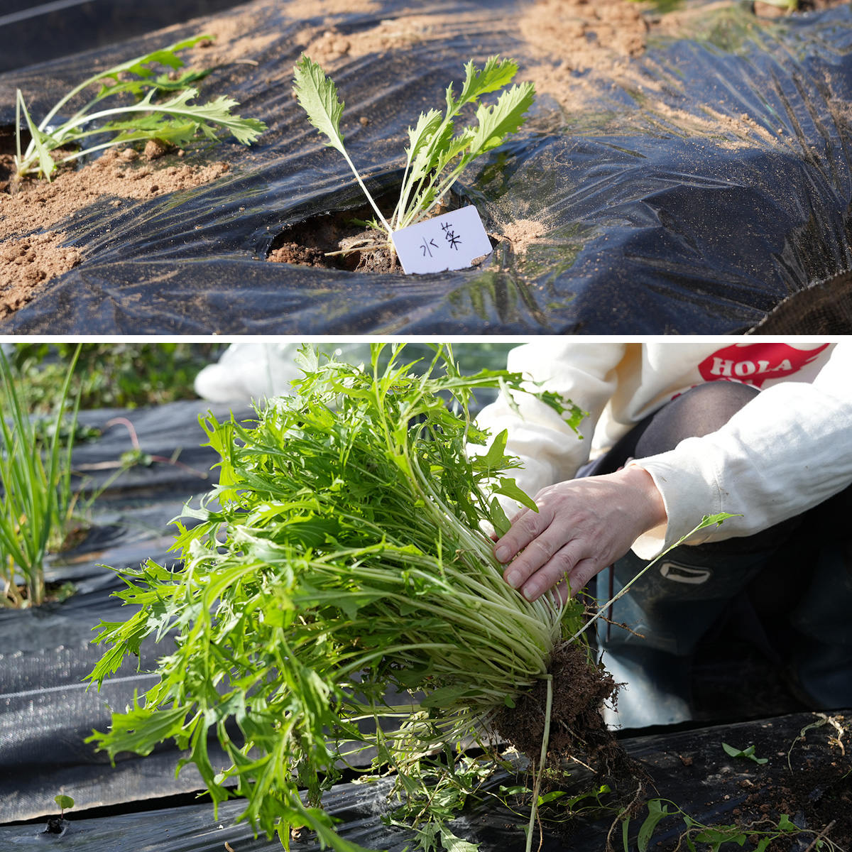 ▲上の写真が植え付け時、下の写真が約2ヶ月後の水菜