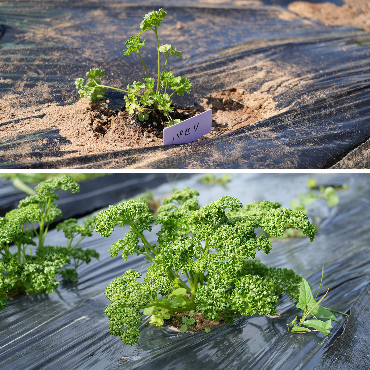 ▲上の写真が植え付け時、下の写真が約2ヶ月後のパセリ。