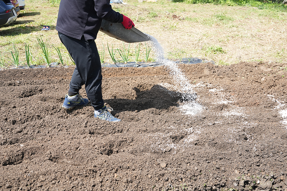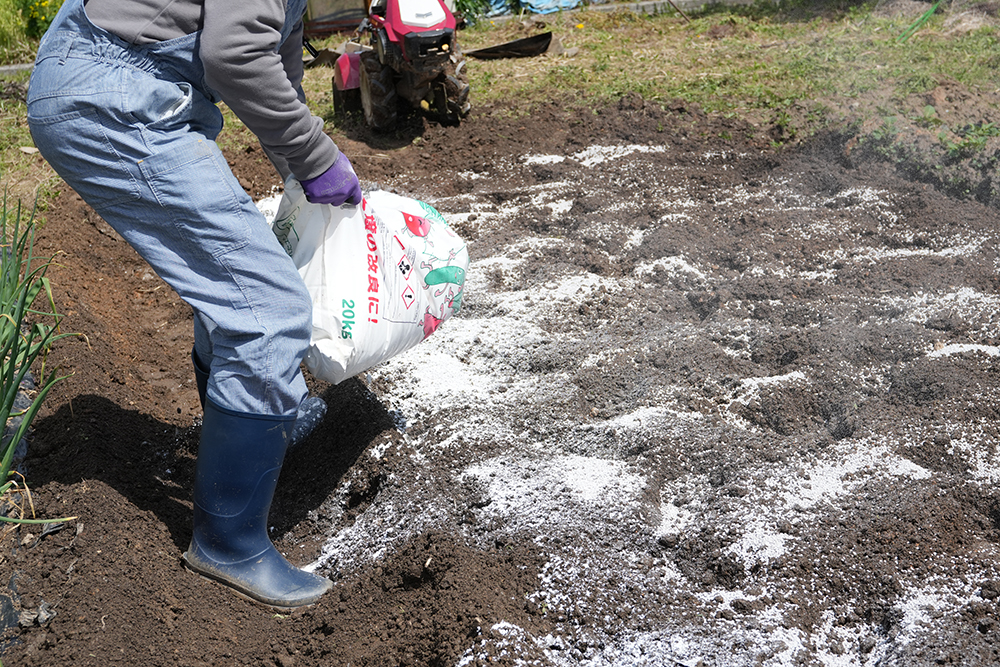 次に石灰を撒き、土壌の酸度(pH)を調整します。