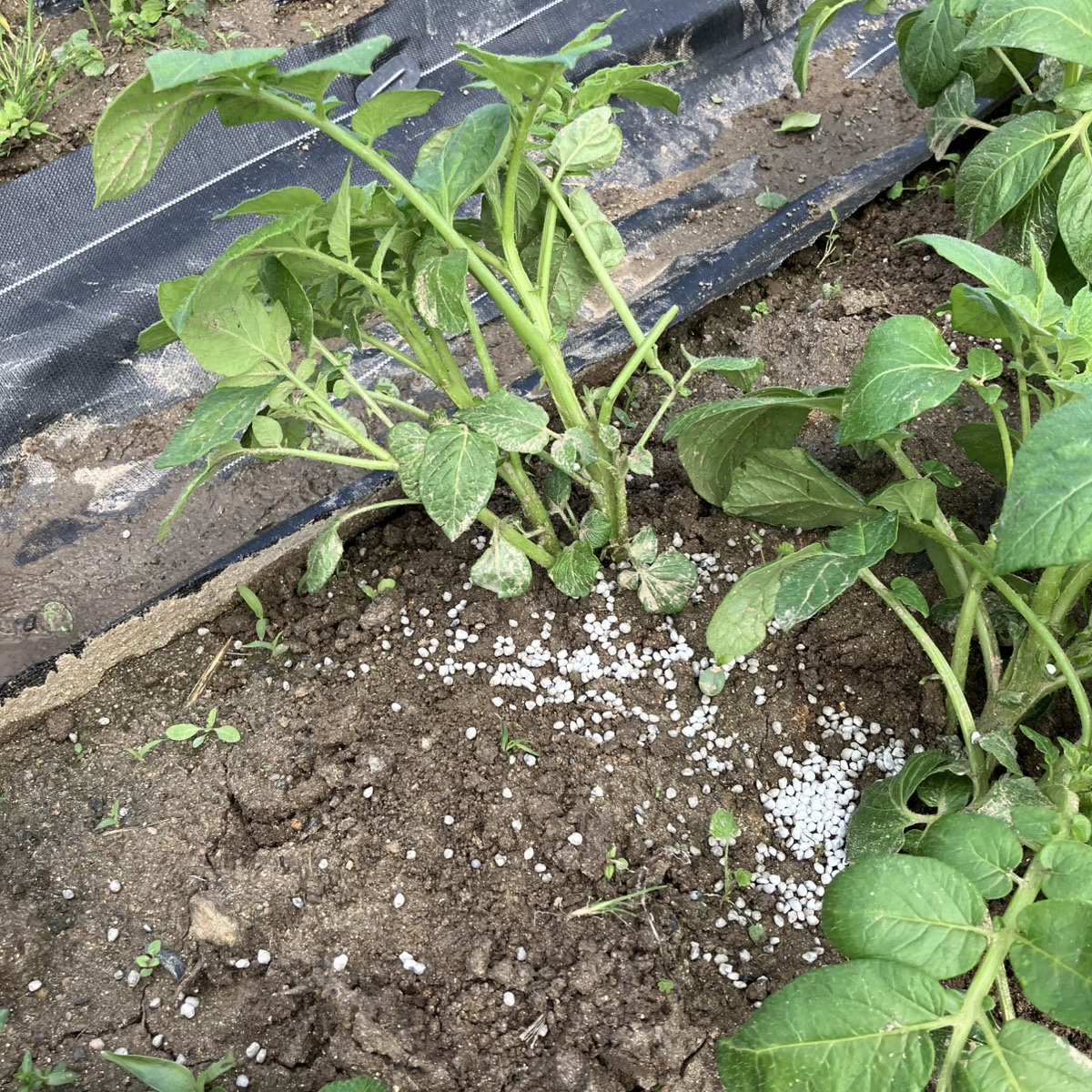 一株あたり15g~25gを目安に、ジャガイモの株と株の間にまんべんなく巻いていきます。