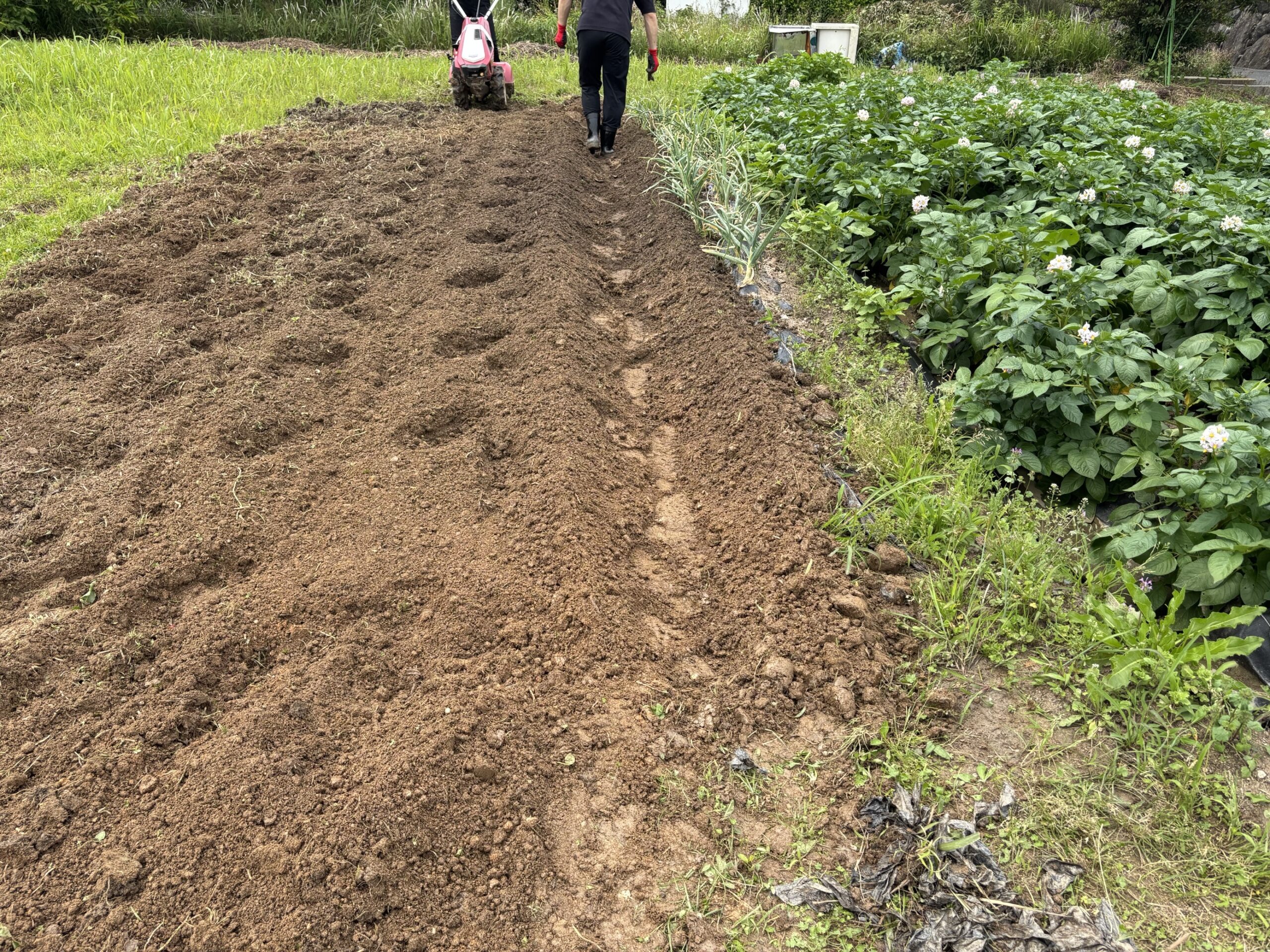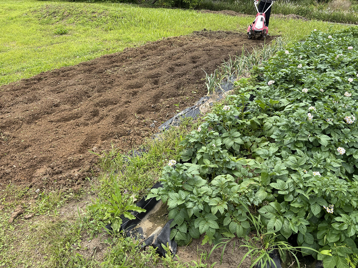 前回は、畑の土に肥料を混ぜて新たに畝を作りジャガイモの種イモを植え付けました。