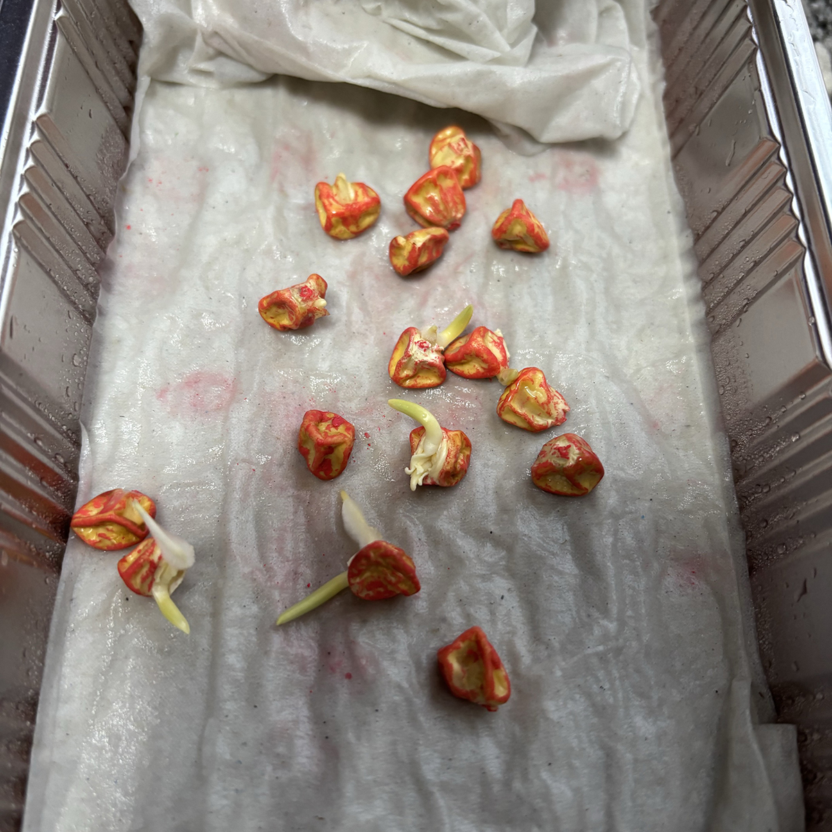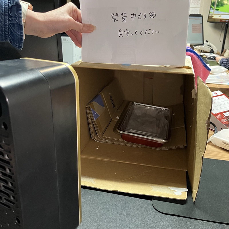 まずは、使い捨て弁当箱を購入し、種を水につけて、保温のために段ボールで囲い、湿らせたキッチンペーパーの上で置いて発芽させてみます。