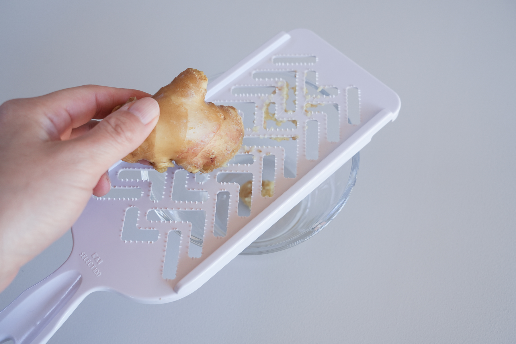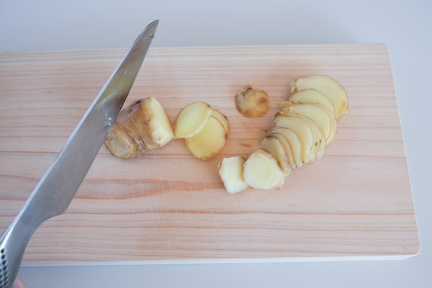 ショウガの風味を最大限に生かすために、半分はすりおろし、半分は薄くスライスして準備します。
