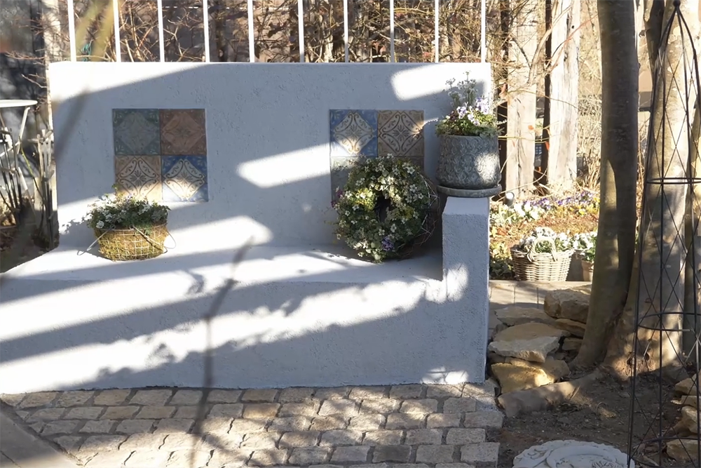 木の下に作られた半日影の白いベンチは、こだわりのタイルを貼ってアンティーク風に。