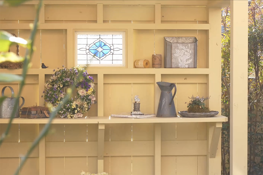作家さんのステンドグラスをあしらった小屋は、植物や小物が置けるディスプレイ棚付き。