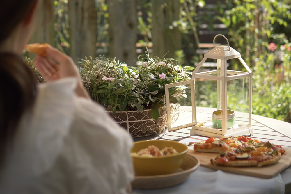 自宅でとれた夏野菜を使った自家製ピザを、庭を眺めながら食べる贅沢な時間。