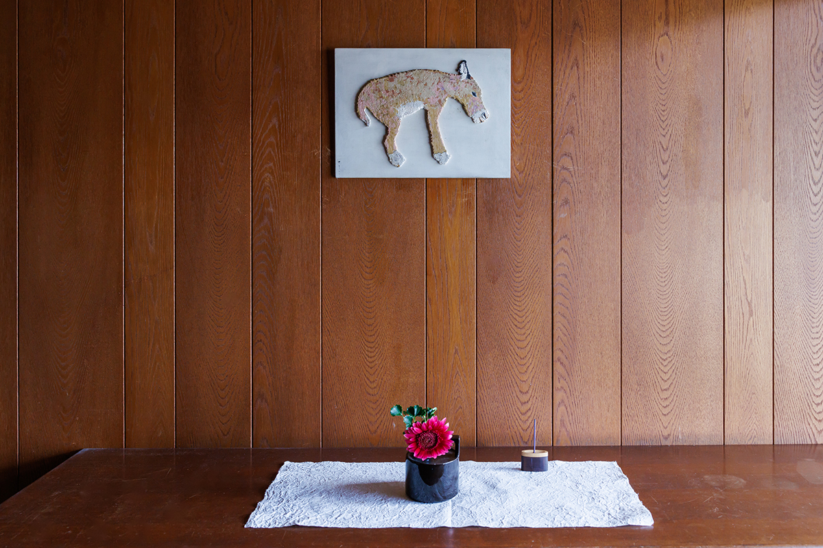 玄関には、通年で絵と花を飾ることが多いという落合さん。夏だけは花のもちが悪いため、オブジェなどを置いています。「スペースがある方は、枝ものに挑戦してみてはいかがでしょう。ちょっと特別感のある玄関になりますよ」。生花は手入れの必要があるため、リースやスワッグといった天然素材の雑貨を飾るのもおすすめだそう。ゲストを出迎える場面に、植物の穏やかな雰囲気をプラスしましょう。
