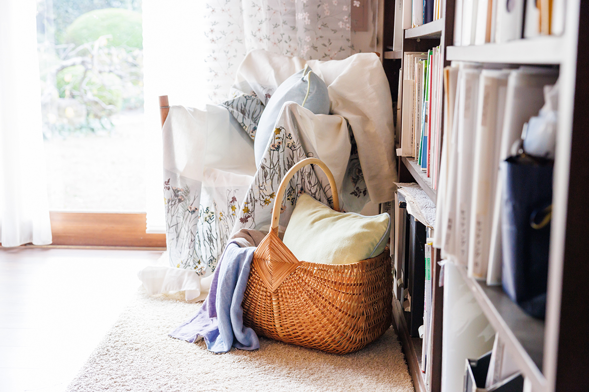 年中来客の絶えない落合さん宅。季節感を表現するには、洗い替えもできる布アイテムを活用しています。おすすめは、価格も手ごろなクッションカバー。「夏は麻素材、秋冬はベロアで数色を取り揃えて、楽しみます。ラグも同じですね」。