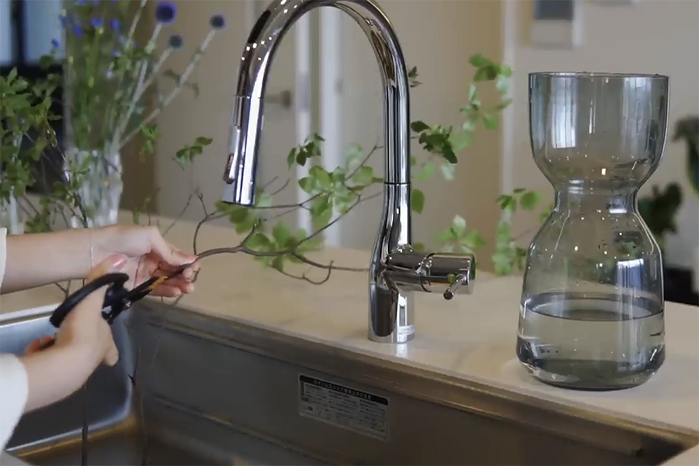 ドウダンツツジは、水の吸い上げやすくするため枝部分に十字に切り込みを入れる。ちょっとした手間が植物を長持ちさせるコツ。