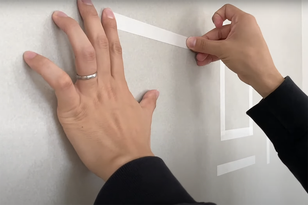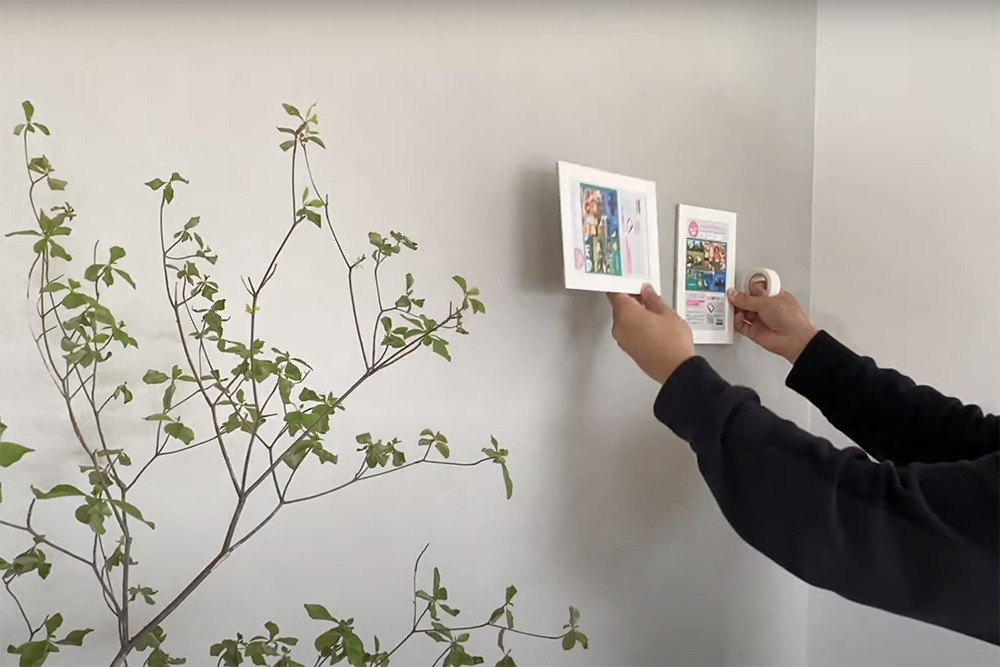 壁側とフォトフレーム側にマスキングテープで保護して両面テープで貼り付ける、壁紙を傷めない固定方法を紹介しています。