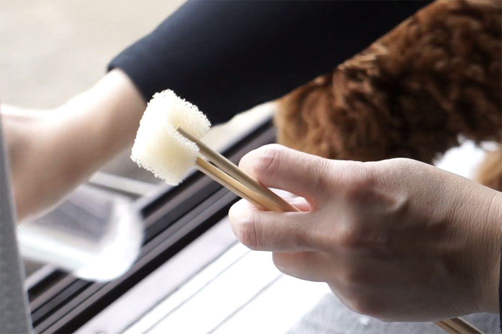 使い古しのスポンジを割り箸に挟んで、窓のサッシの掃除道具に。汚れがキレイになると心もすっきり。