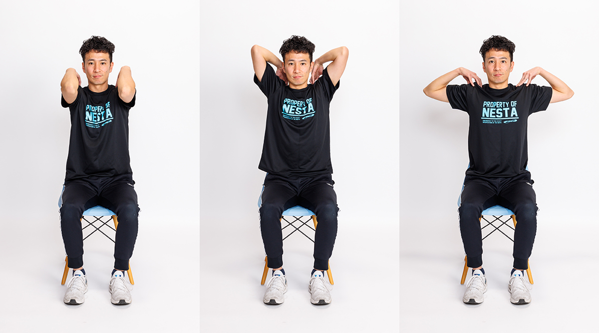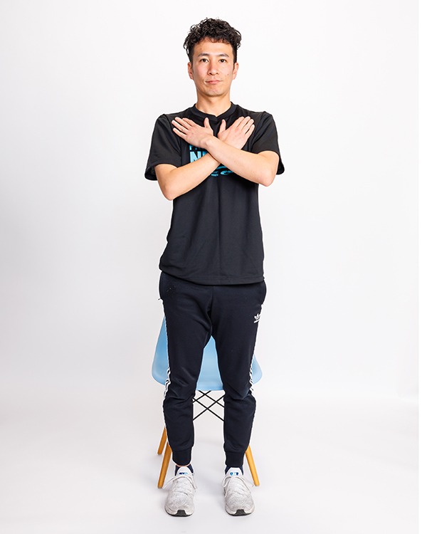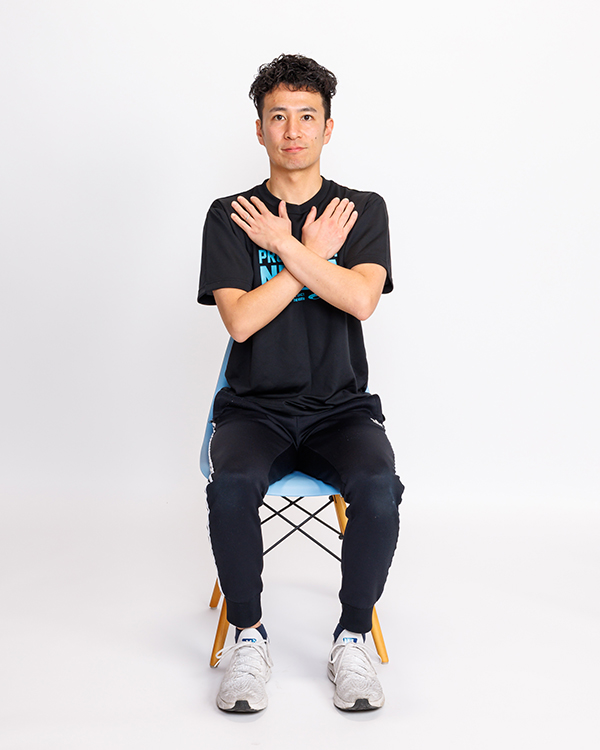 ①胸の前で手をクロス。背もたれには寄りかからないように。