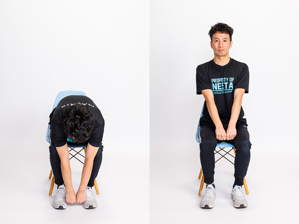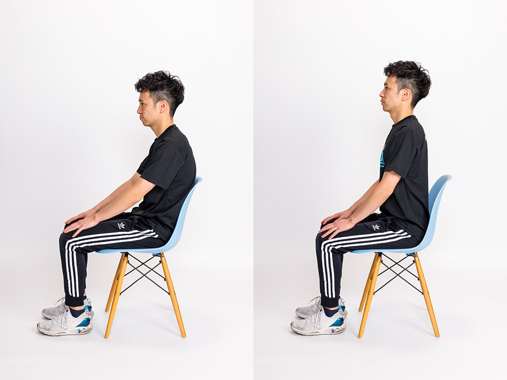 ①座った状態で、頭の位置を動かさないようにして、腰を背もたれに押しつけます。