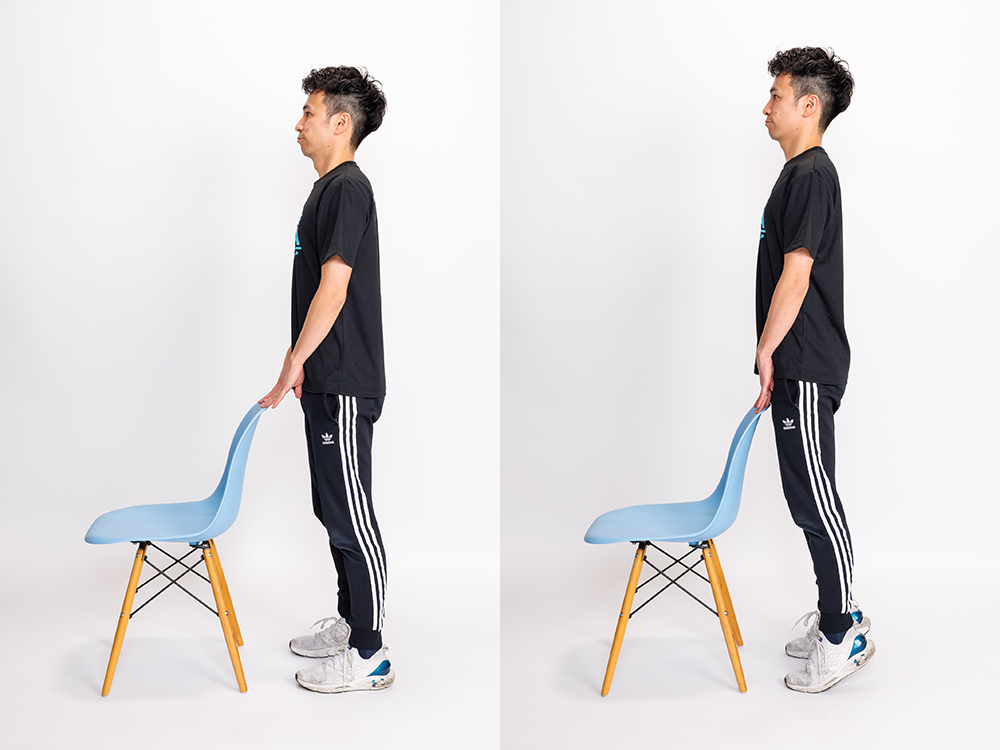 膝に手を置いて腕の力を使ったり、勢いや反動は使ったりしないように。また、立ち上がる瞬間、無意識にかかとを手前に引かないように注意しましょう。