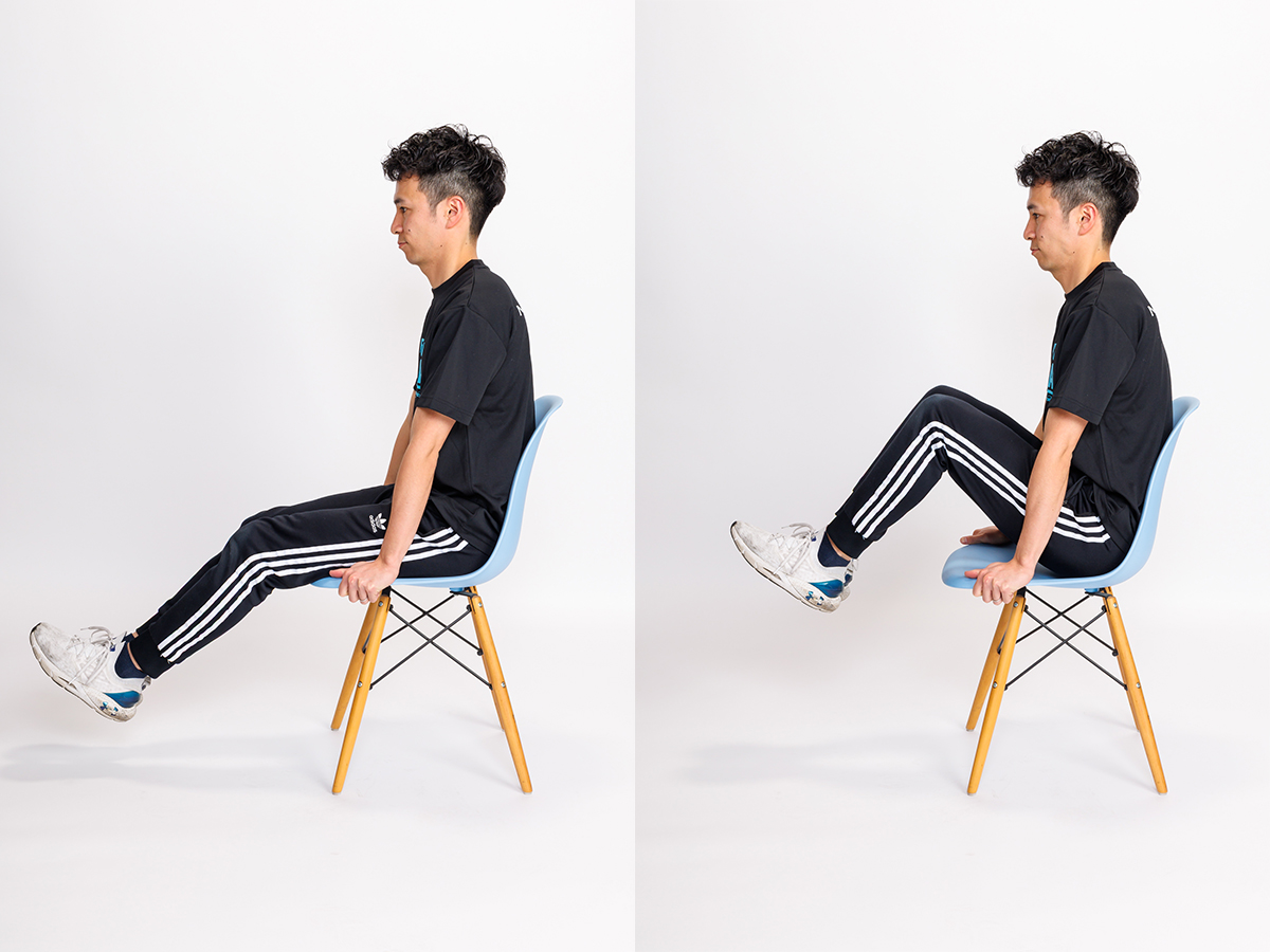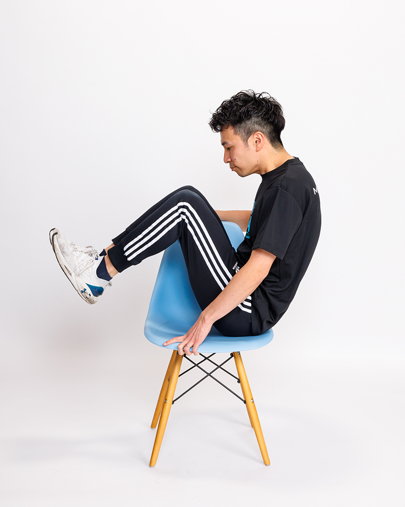 ①手で椅子の両サイドを持ちます。足は少し上げて。