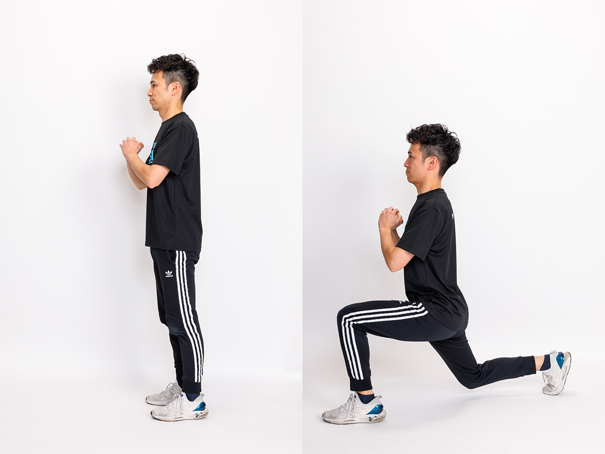 ②左右、どちらかの足を大きく前に踏み出します。膝を曲げて体を下げます。
