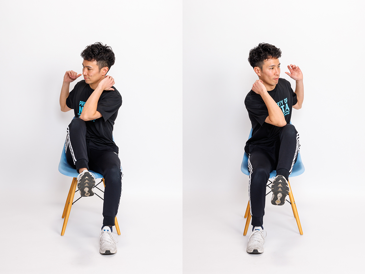 ①椅子に座った状態から、手を後頭部(首)の後ろで合わせておきましょう。