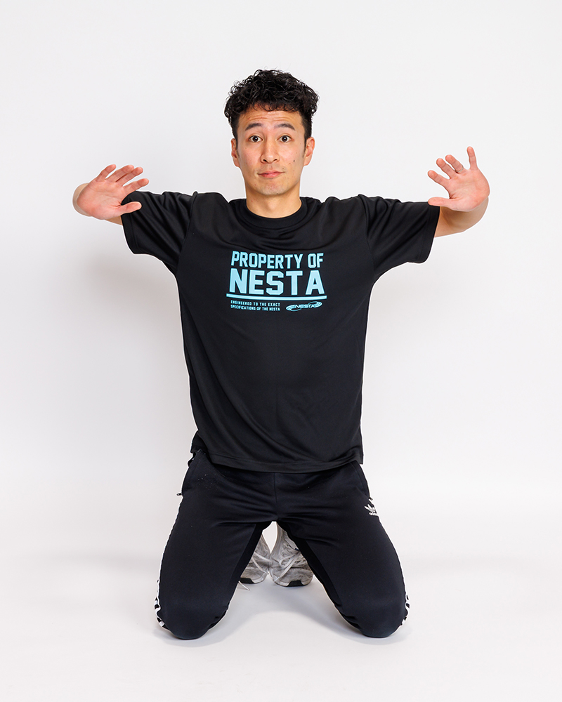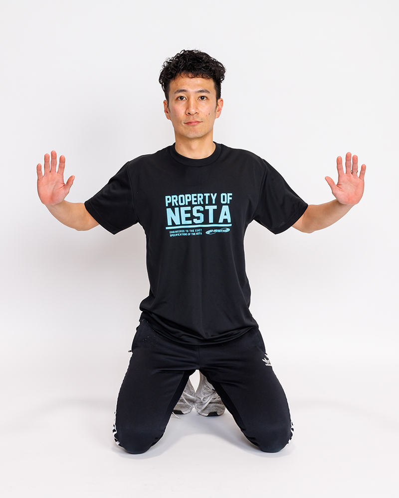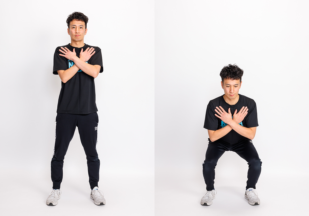 ①胸の前で手をクロス。足は肩幅より少し広めに。