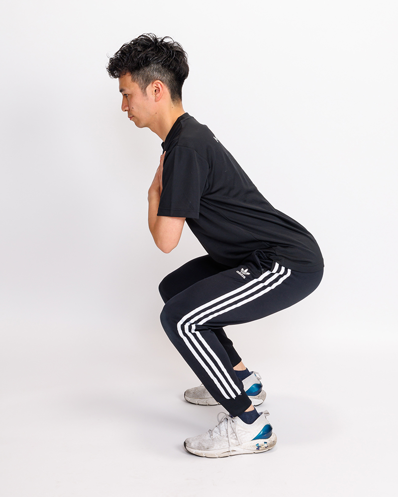 ②上半身はそのままに、お尻を後ろに引くようにして腰を落とします。10〜20回、できる範囲で挑戦しましょう。