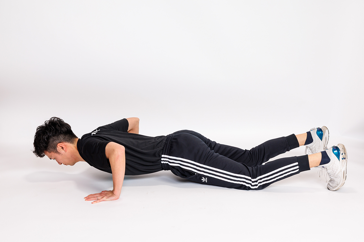②ゆっくり手を曲げて上体を下ろしていきます。胸を張り、お尻から頭が一直線なのは崩れないように。この時、肘が外に広がらないように注意しましょう。上体を上げるときは素早く。
