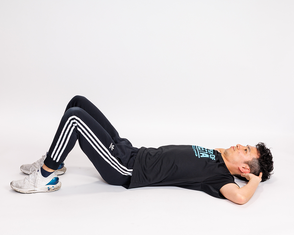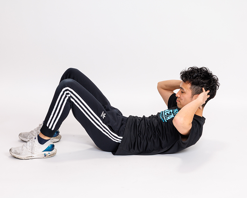 勢いや反動を利用して上体を起こさないように気をつけましょう。また、首に負荷を与えないよう、アゴを引くことを意識してください。