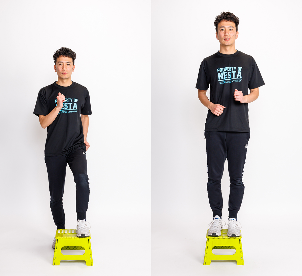 ②1分ほど上り下りしたら、次は反対の足から乗せて、降りる動作を繰り返します。