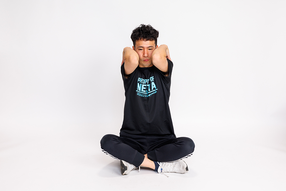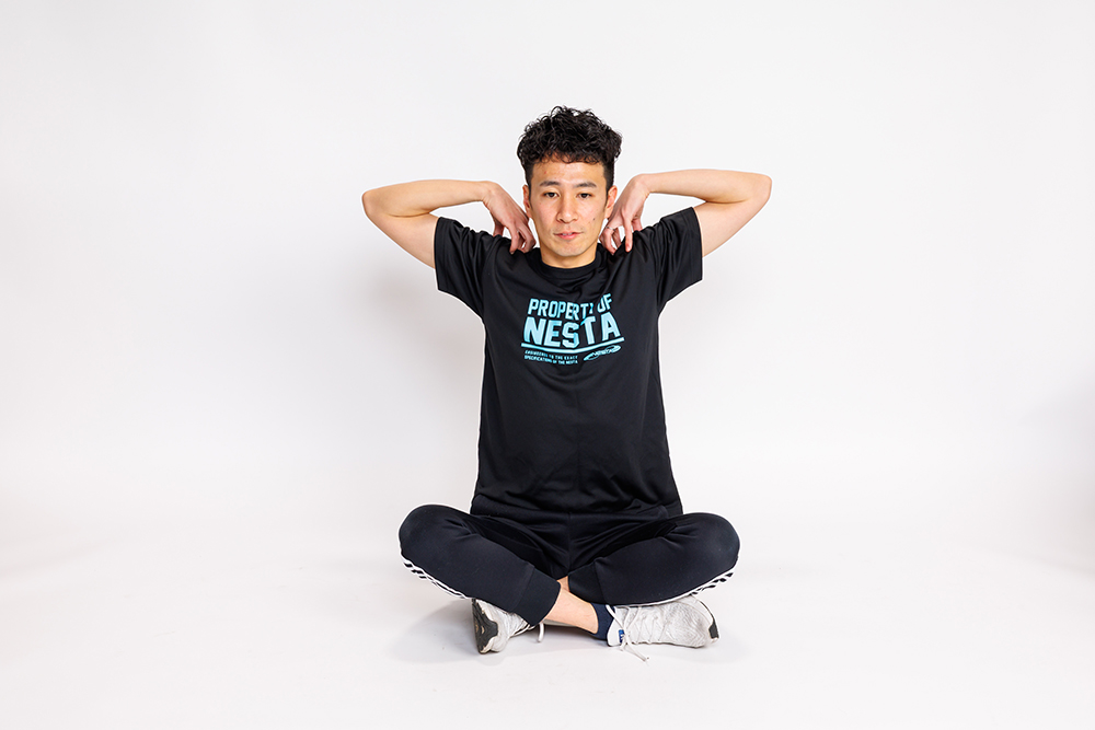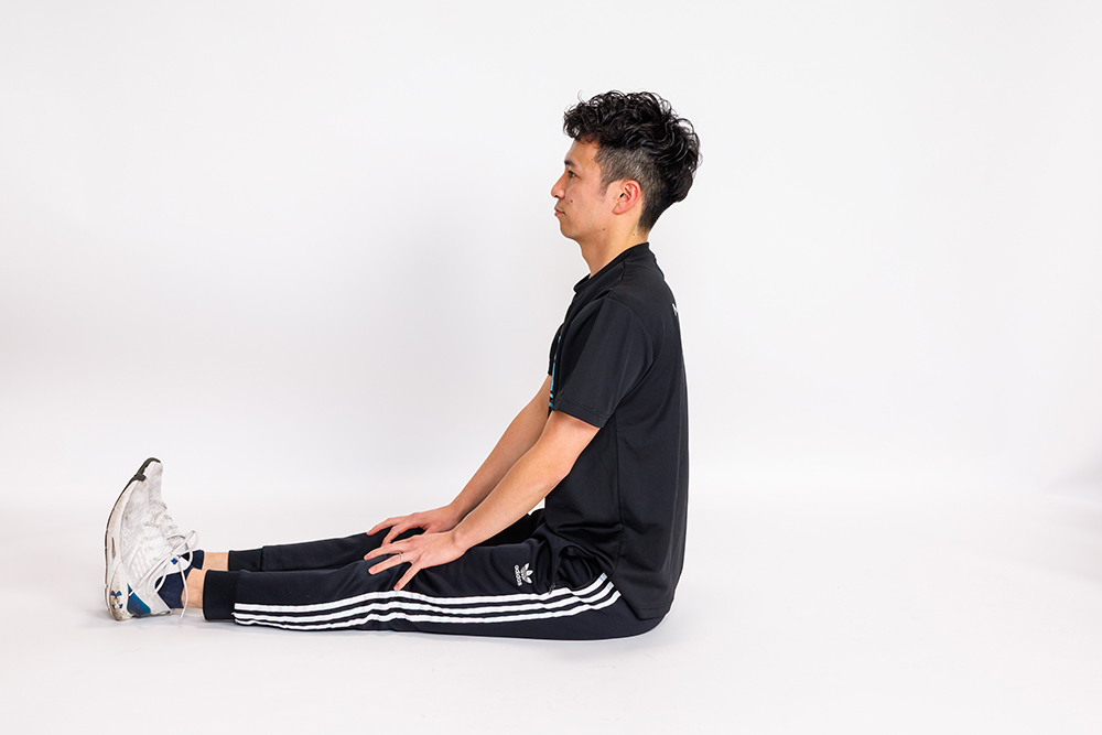 ①足を伸ばし、できる限り背筋を伸ばして座ります。