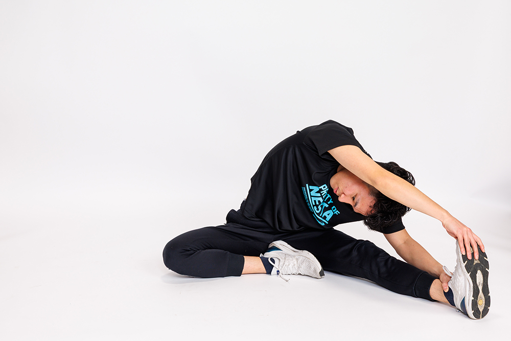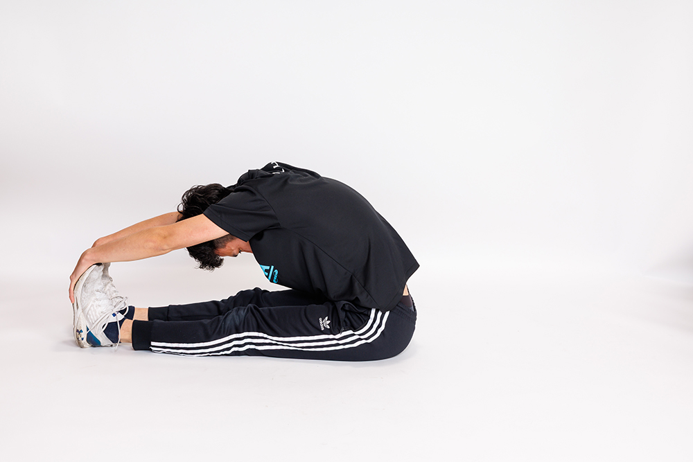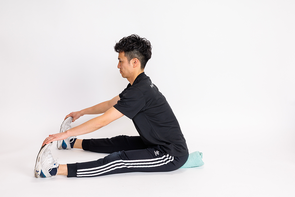 ②背筋を伸ばしたまま、つま先や足の裏を両手でタッチ。体を起こし、この運動をゆっくり繰り返します。10〜20回やってみましょう。