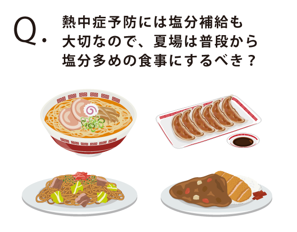 【第1問】熱中症予防には塩分補給も大切なので、夏場は普段から塩分多めの食事にするべき?
