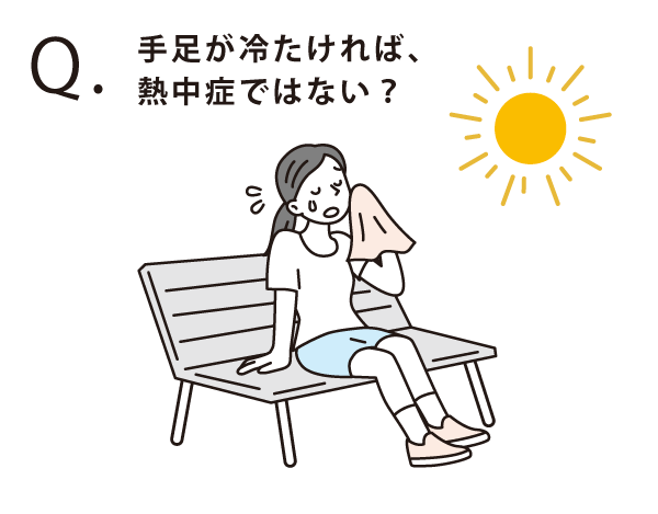 熱中症というと、体温が上がるイメージがありますが、脱水症状を起こしている場合は、手足が冷たくなることがあります。たくさん汗をかいて脱水状態になると、血液の循環が悪くなり、体温を調節できなくなるのがその理由です。“高体温ではないから、熱中症ではない”というのは、誤った認識だといえます。