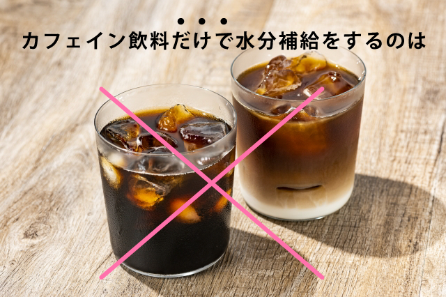 カフェインには利尿作用があるため、水分補給を意識して大量に飲んでしまうと、脱水を誘発する可能性があります。糖分の過剰摂取も脱水を起こしやすくするため、特に甘いカフェイン飲料は要注意。気分転換に1杯程度を飲むのであれば問題ありませんが、カフェイン飲料だけで水分補給をするのは望ましくないといえます。